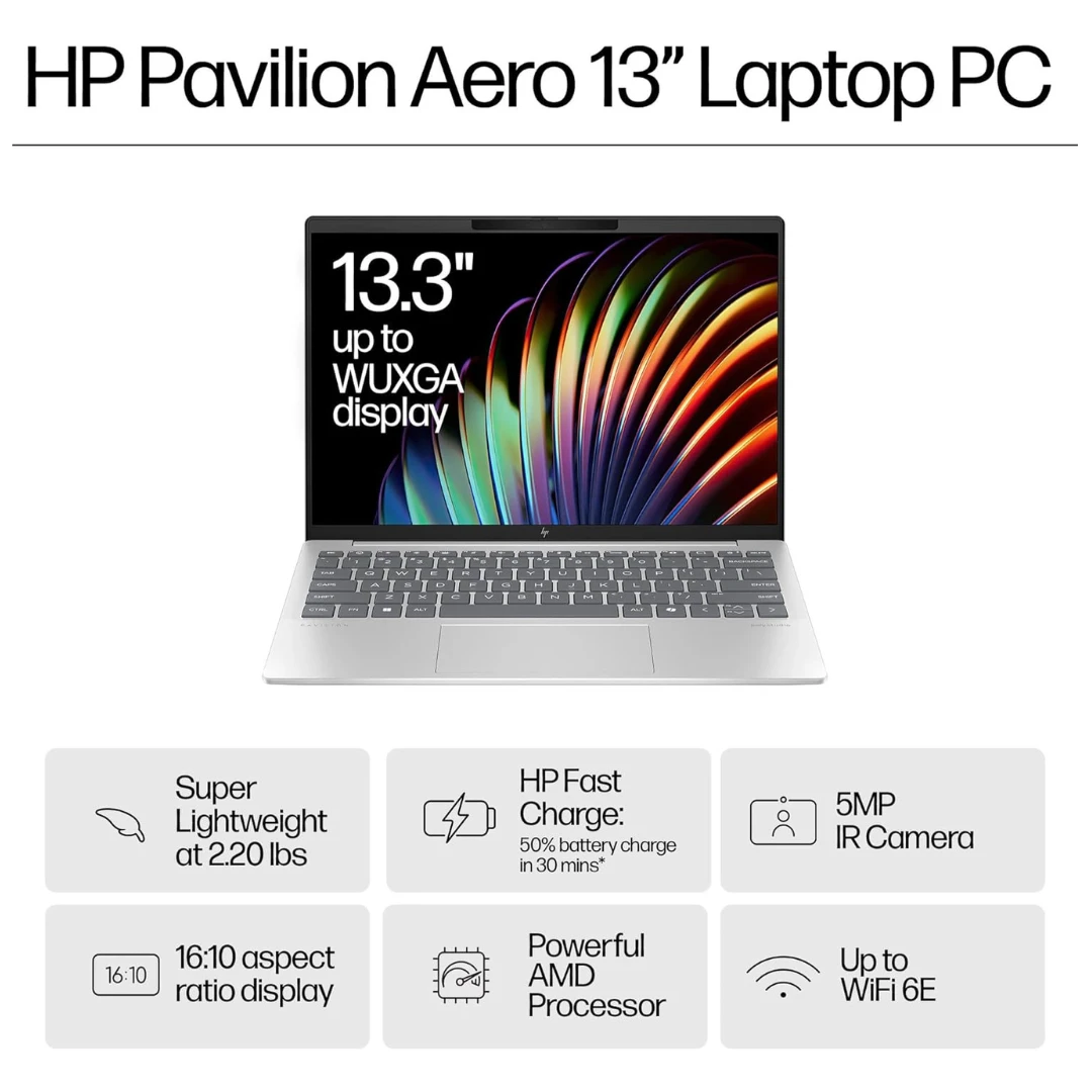Designed for comfort and durability, the laptop features a full-size backlit keyboard and a large touchpad in a compact form factor. Wi-Fi 6 connectivity and a comprehensive set of ports, including USB-C and USB-A, provide modern versatility. With all-day battery life and a minimalist design, the HP Pavilion Aero 13 is the perfect blend of power, portability, and style.
