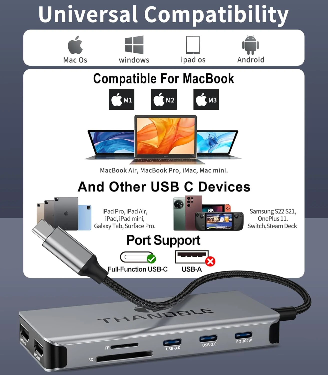 Crafted from premium aluminum alloy, the hub effectively dissipates heat to ensure stable performance during extended use. Its compact and portable design makes it the perfect travel companion for on-the-go productivity. The plug-and-play functionality requires no additional drivers or external power for most functions, offering instant connectivity.